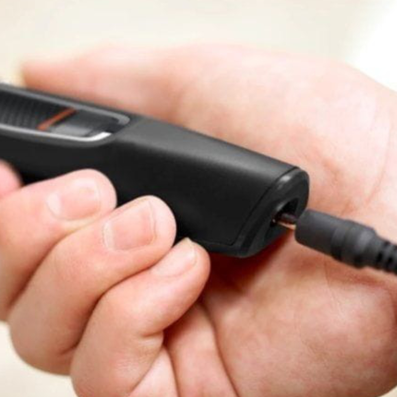 Inclui nove acessórios, entre os quais um aparador de precisão em aço, um aparador para nariz e orelhas, e seis pentes reforçados (dois para barba curta de 1 e 2 mm, um pente de barba ajustável e três pentes para cabelo de 9, 12 e 16 mm).