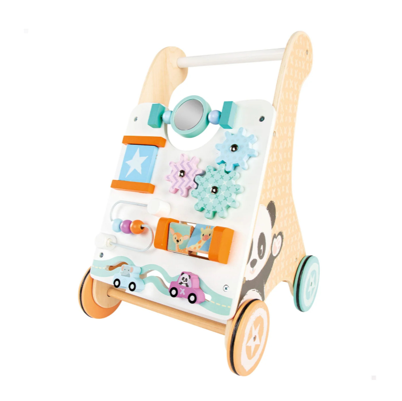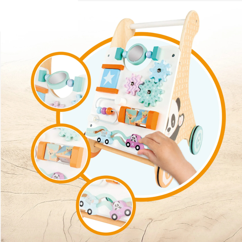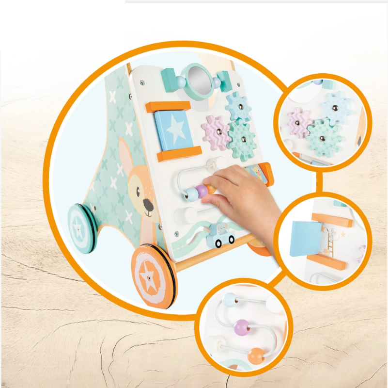O Andador de Atividades em Madeira Woomax é o companheiro ideal para apoiar os primeiros passos do bebé, oferecendo ao mesmo tempo um painel repleto de brincadeiras educativas.