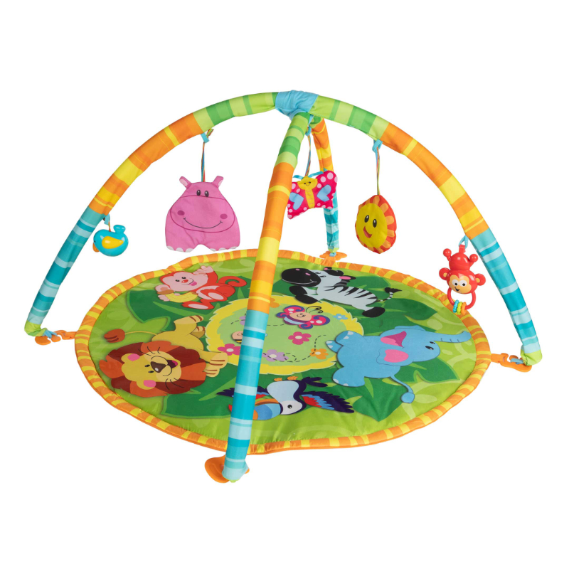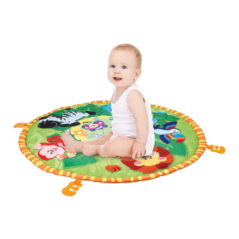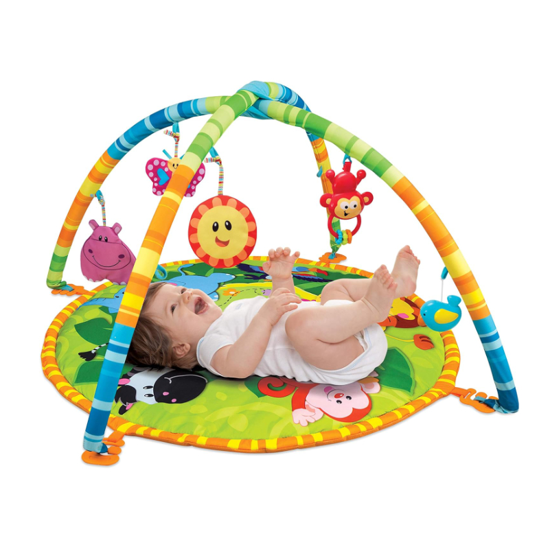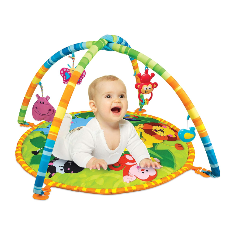 O seu design colorido, inspirado na vida selvagem, inclui brinquedos divertidos e elementos sensoriais que incentivam o alcance, a descoberta e o desenvolvimento motor.