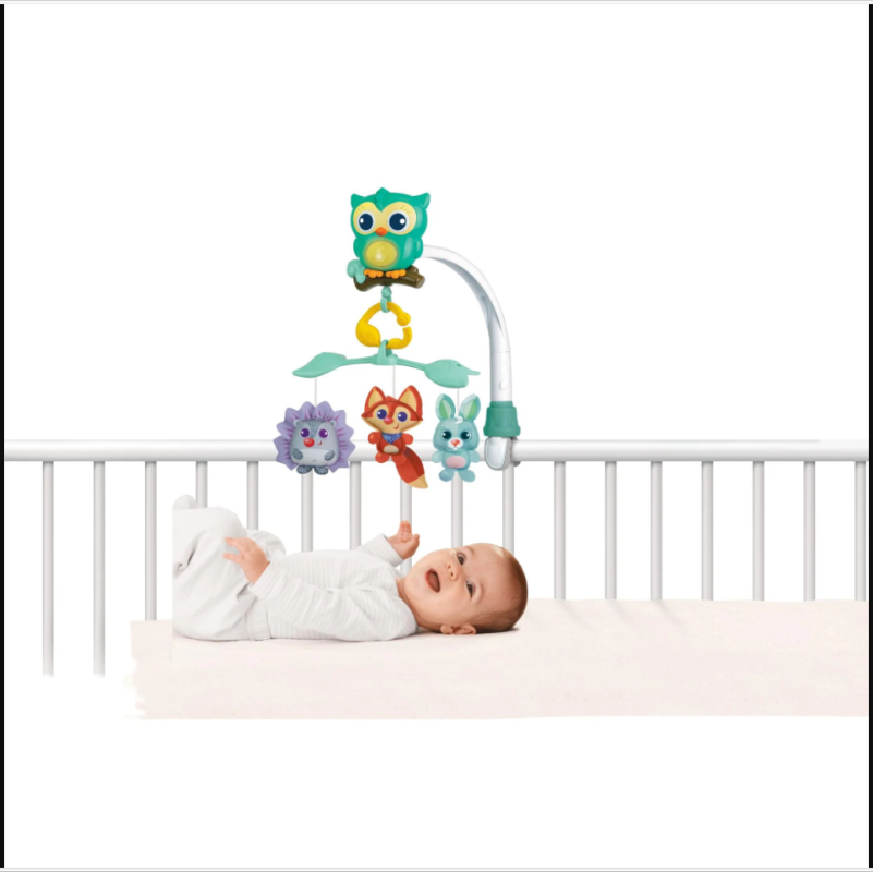 Com cores suaves, personagens da floresta, música relaxante e movimento giratório, este móbil ajuda a desenvolver a perceção visual e auditiva, além de criar uma rotina tranquila para adormecer.