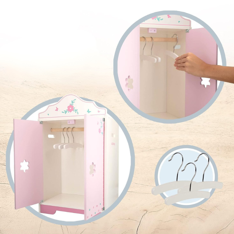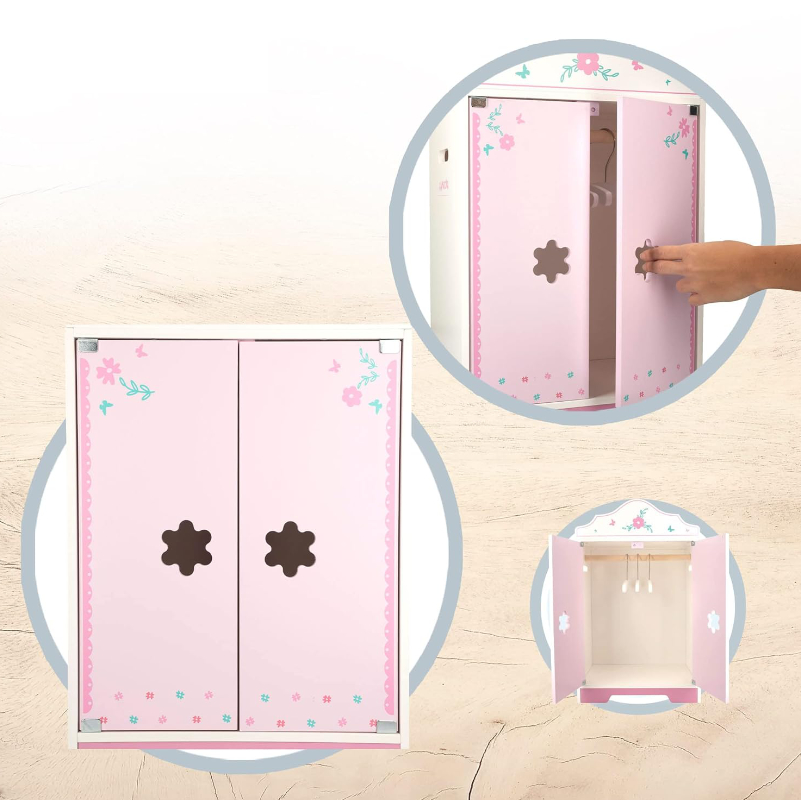 Com portas que abrem e fecham facilmente e um varão interno para os 3 cabides incluídos, as crianças podem vestir, trocar e arrumar as roupas das bonecas como se fosse um armário real.