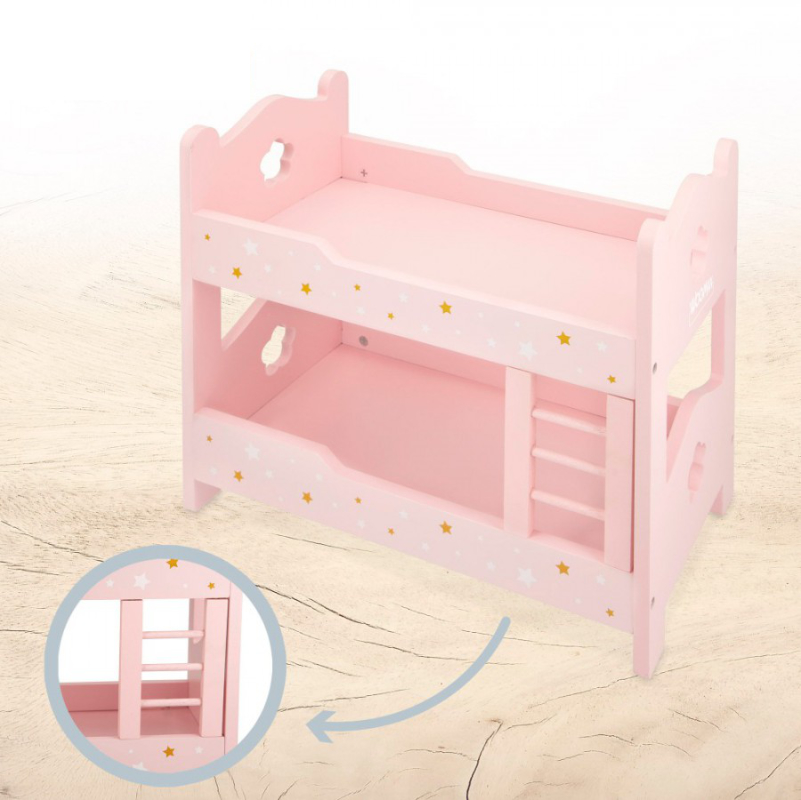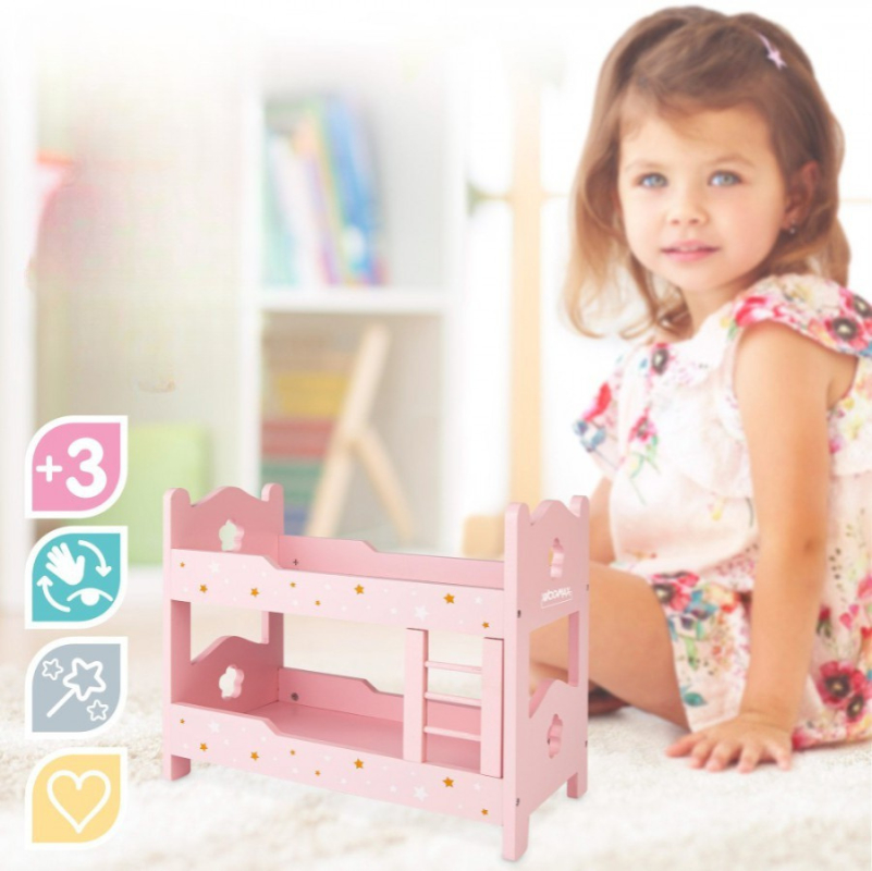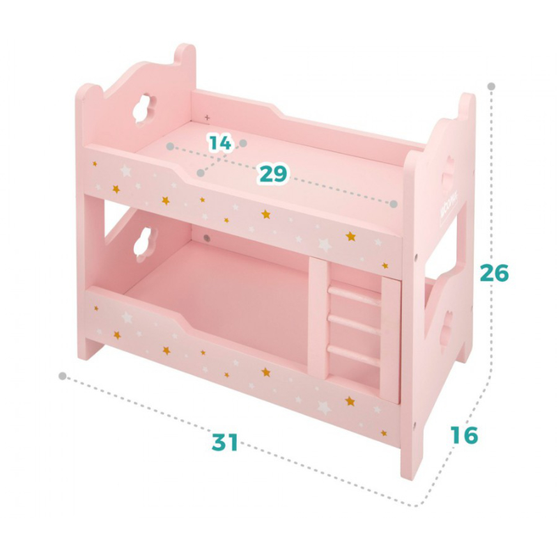 Com um design encantador, em madeira resistente e acabamentos suaves, este beliche permite que as crianças cuidem das suas bonecas como se fossem verdadeiras “mini-mamãs” ou “mini-papás”.