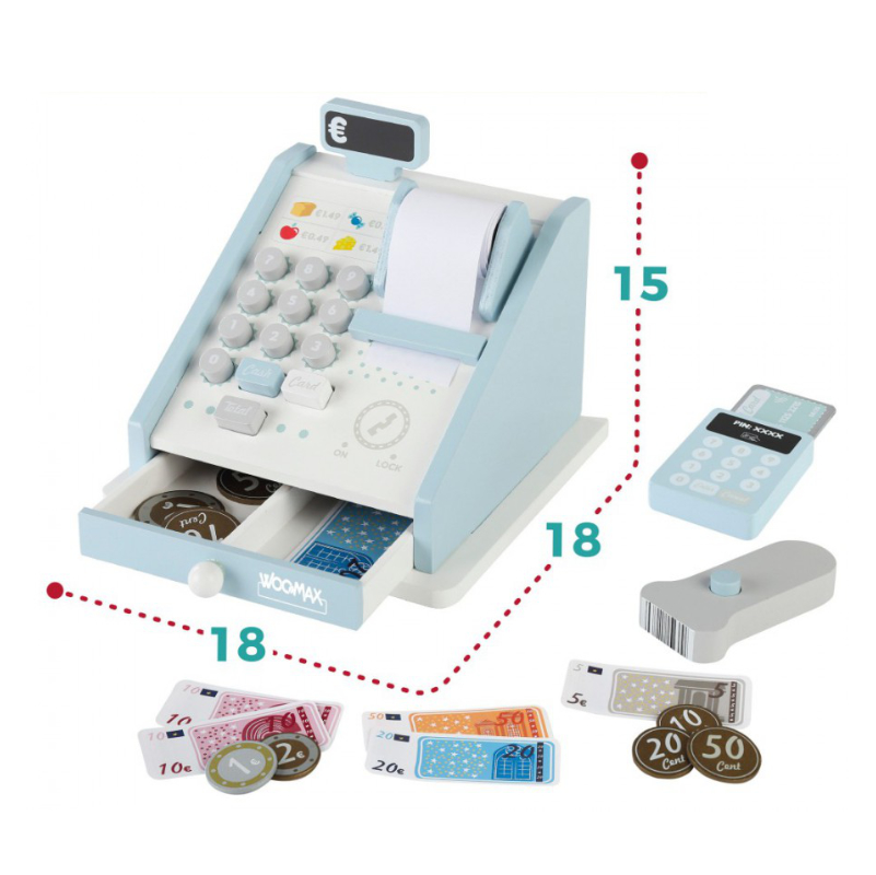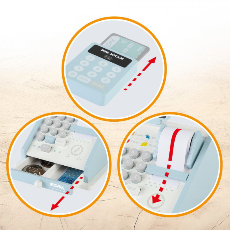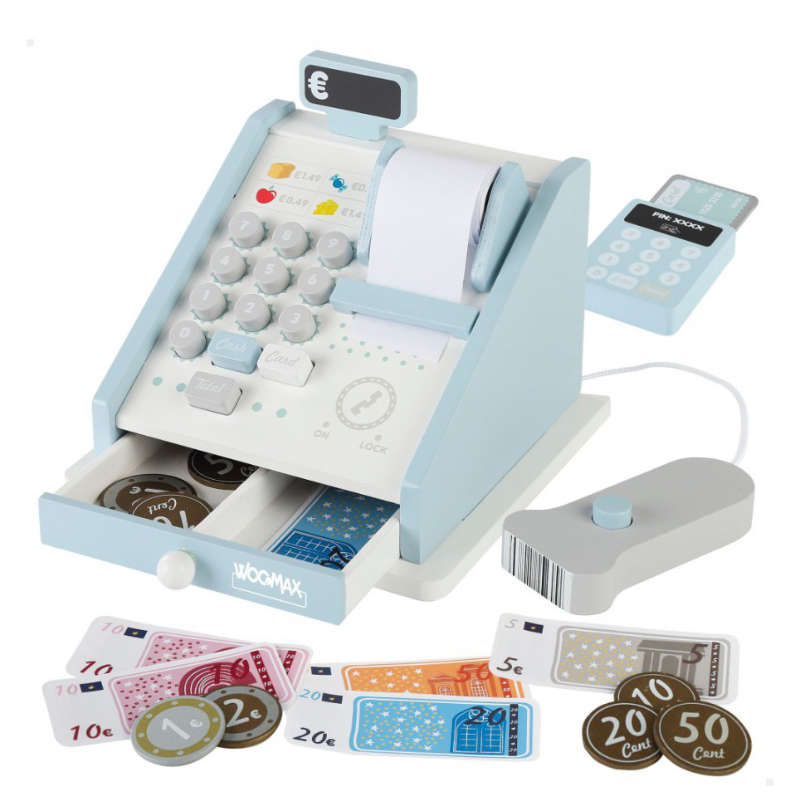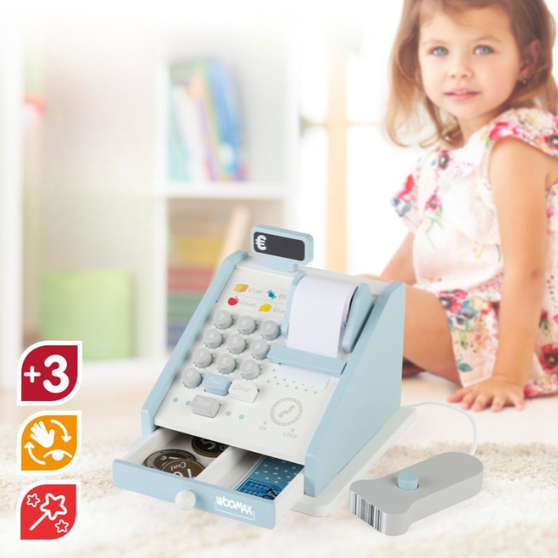 A Caixa Registadora de Madeira Woomax é o brinquedo ideal para dar vida às primeiras brincadeiras de faz-de-conta das crianças.