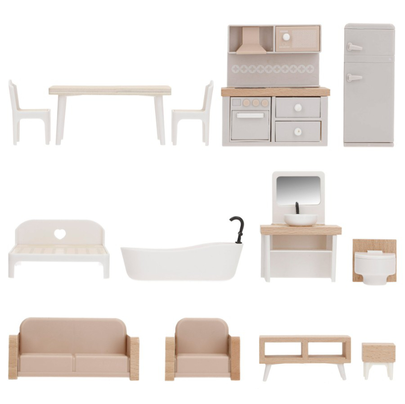 Inclui mobiliário em madeira para equipar cada divisão, permitindo brincar imediatamente após montar.