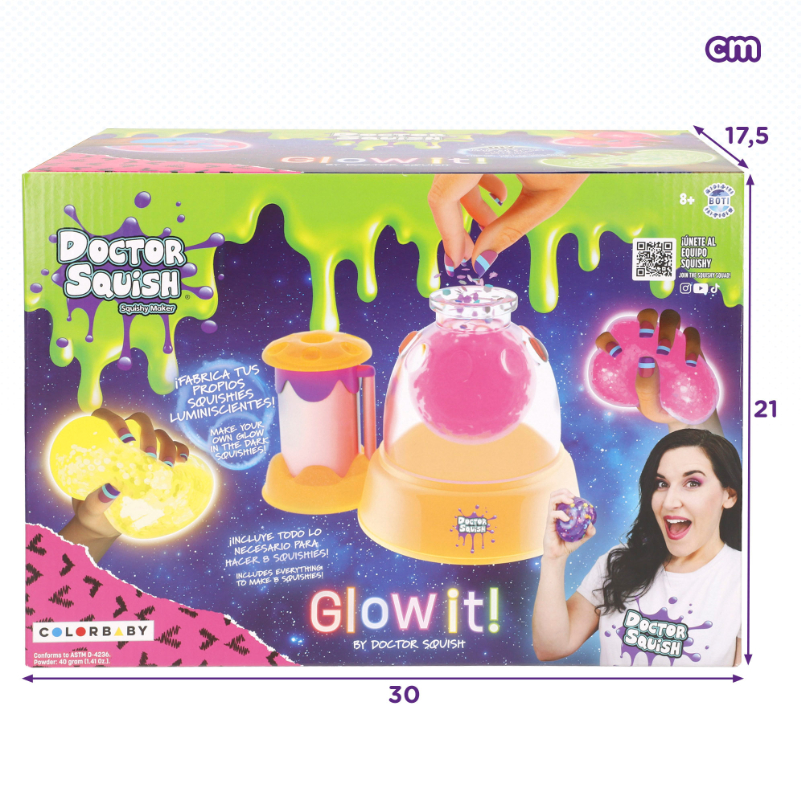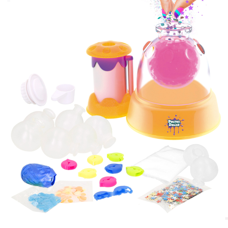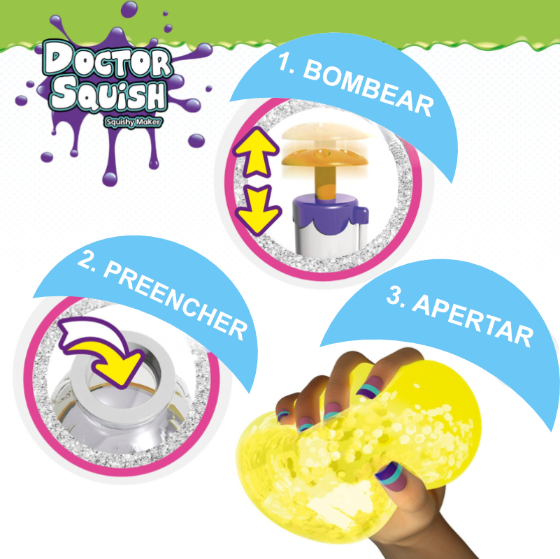 A Estação de Fábrica de Bolinhas Macias Doctor Squish – Edição Neon permite às crianças criar as suas próprias bolinhas squishy personalizadas com cores vibrantes e efeitos neon.