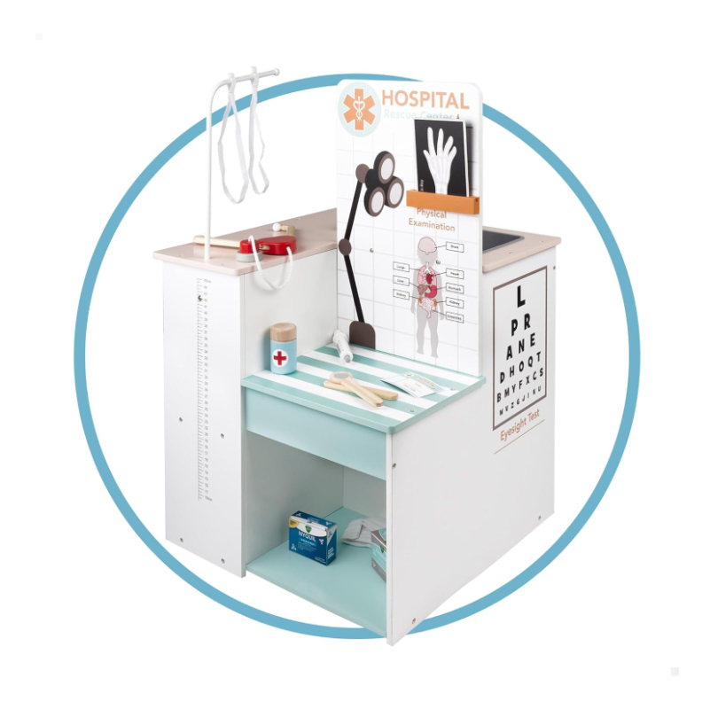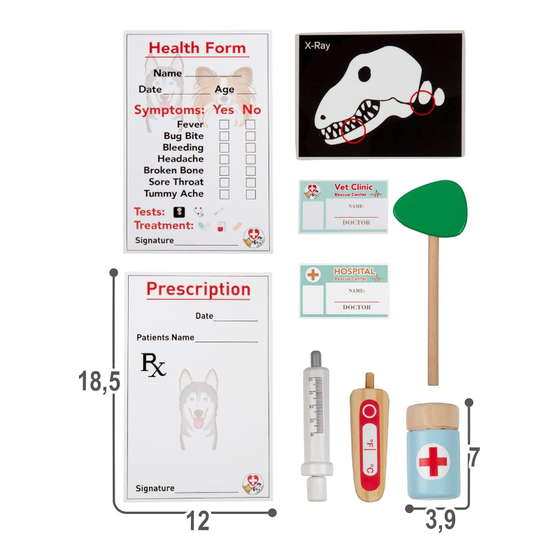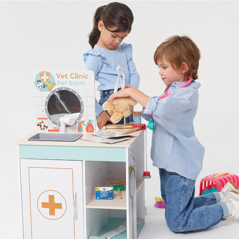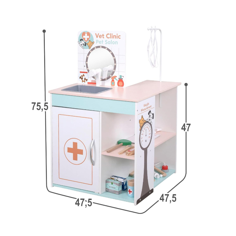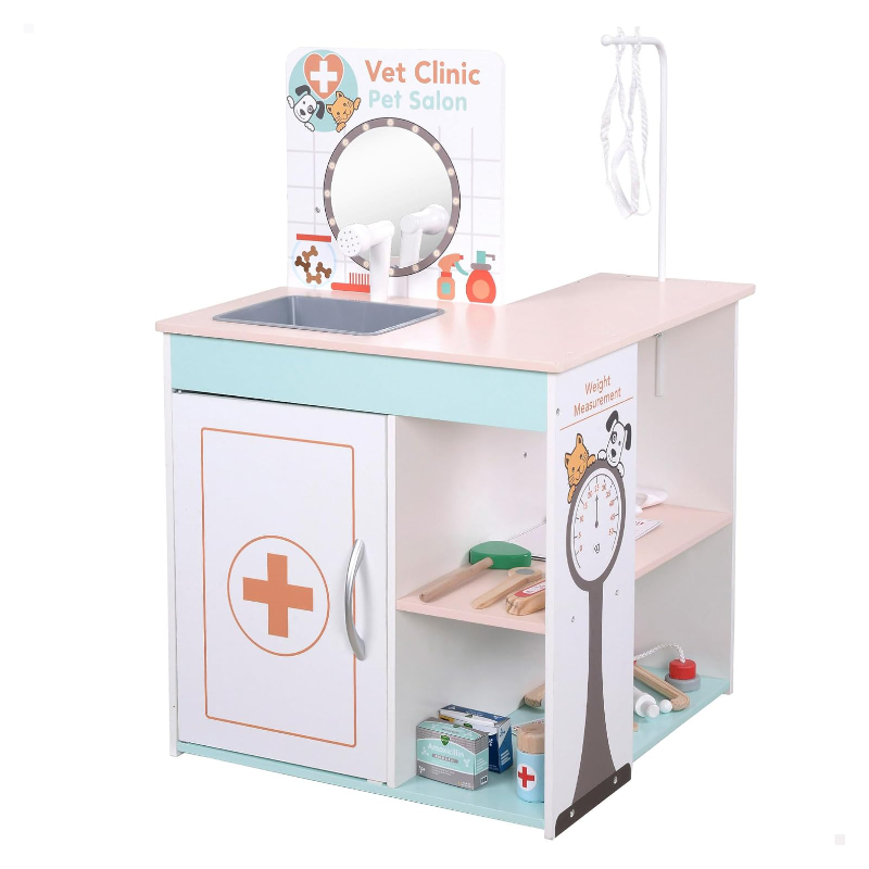 Multifuncional, combina hospital veterinário, posto médico e salão de higiene para cães num só brinquedo de madeira, permitindo que a criança escolha qual profissão quer explorar: veterinário, médico ou estilista de animais.