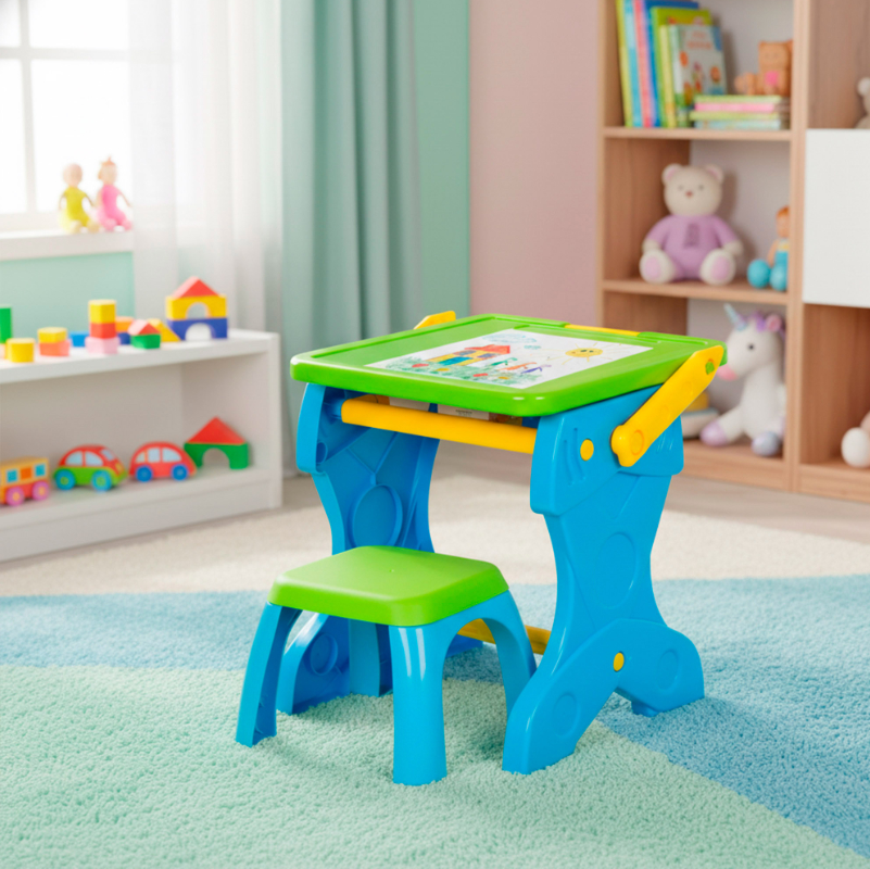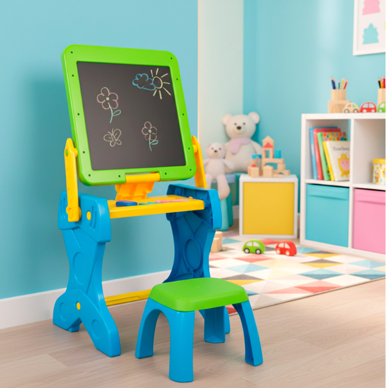 Com um design prático e funcional, a criança pode alternar facilmente entre desenhar sentada à mesa ou desenhar no quadro, estimulando a criatividade, a expressão artística e a coordenação motora.