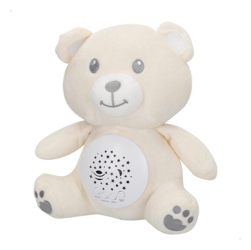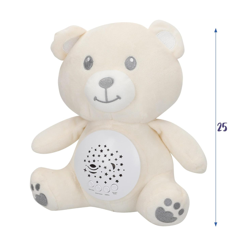 Suave, acolhedor e com luzes relaxantes, este ursinho combina funções de luz noturna, melodias calmantes e temporizador automático, ajudando o bebé a adormecer de forma tranquila e segura.