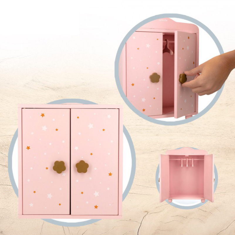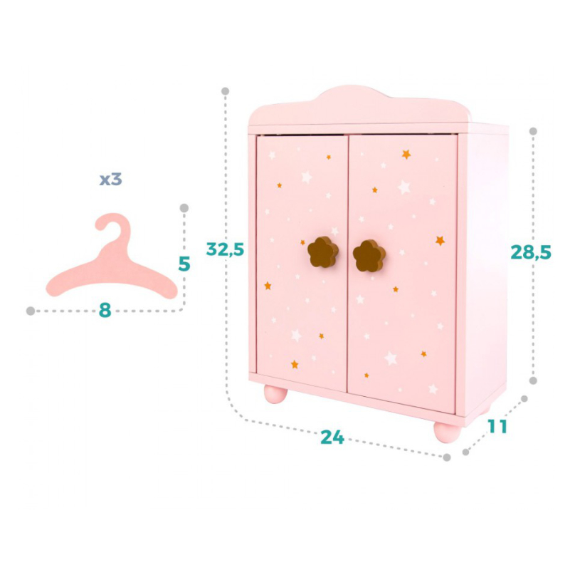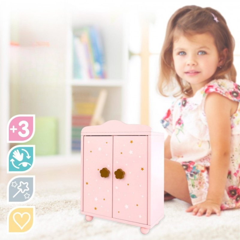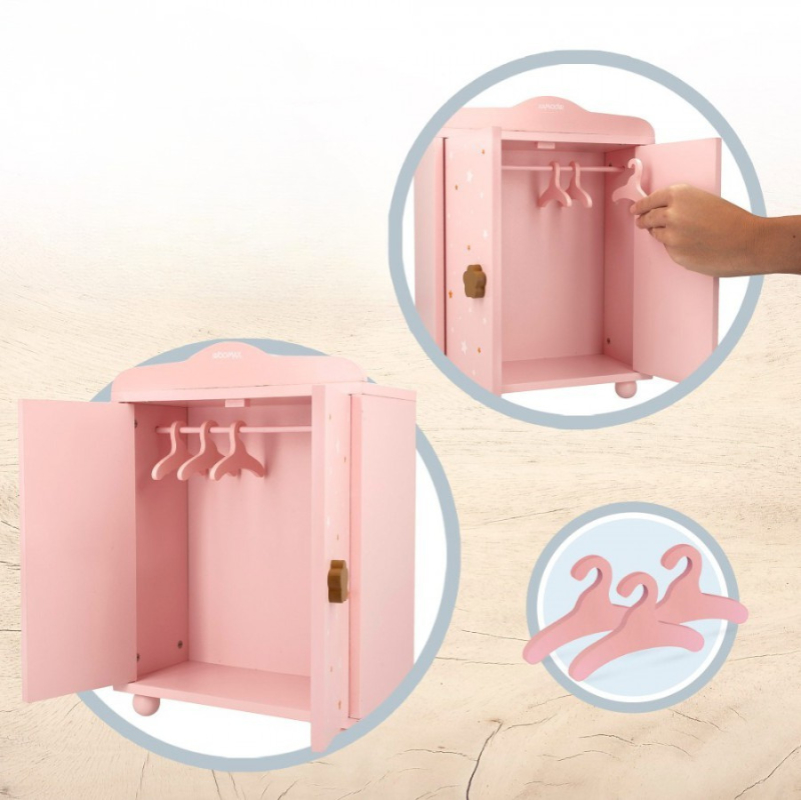 O armário inclui 3 cabides para pendurar roupas de boneca, incentivando a imaginação e permitindo às crianças reproduzir situações do dia a dia.