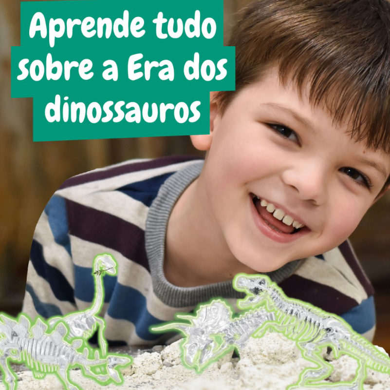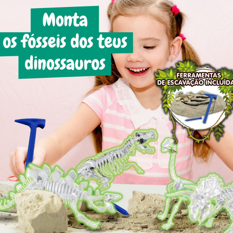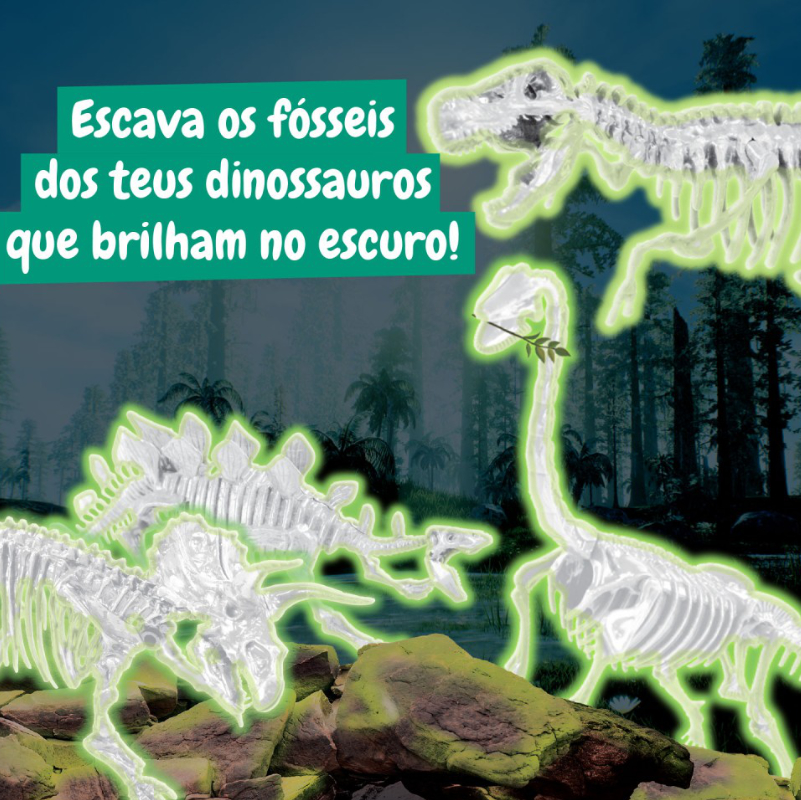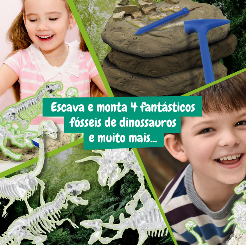 Este brinquedo científico permite às crianças descobrir fósseis de dinossauros que brilham no escuro, explorando técnicas reais de escavação enquanto aprendem sobre a história destes animais pré-históricos.