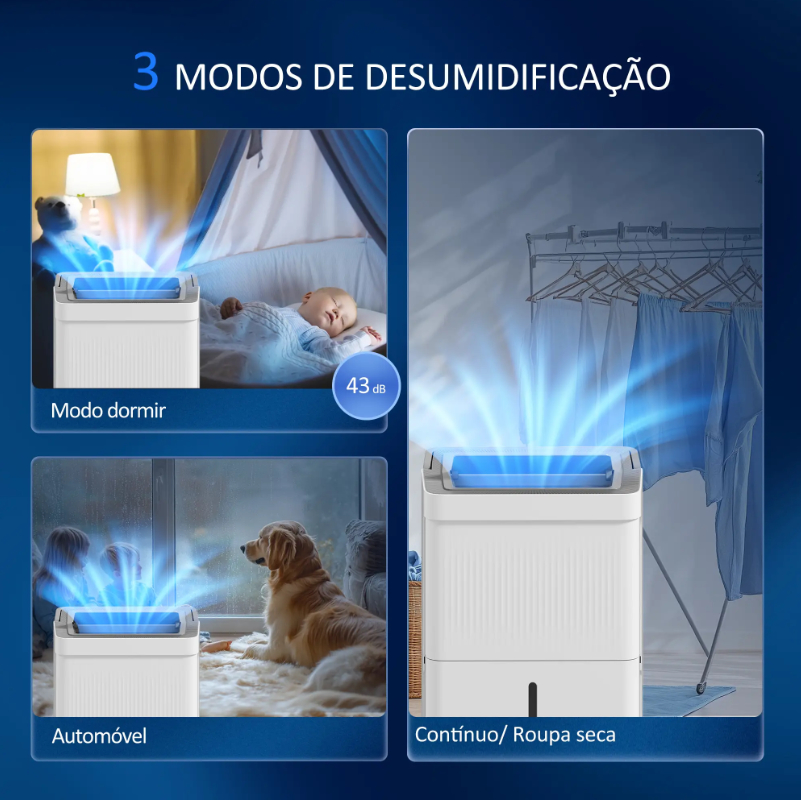 3 modos de funcionamento: Automático, Sono e Secagem contínua
