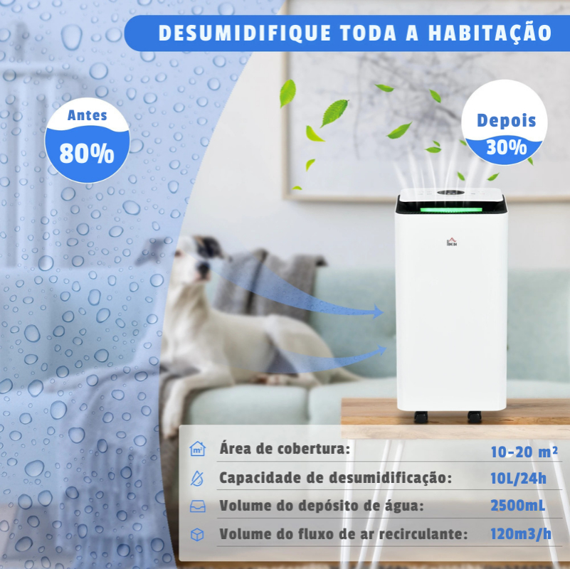 Com capacidade para remover até 12 litros de humidade por dia e um depósito de água de 2,5 L, é ideal para ambientes interiores como quartos, salas de estar, cozinhas e escritórios.