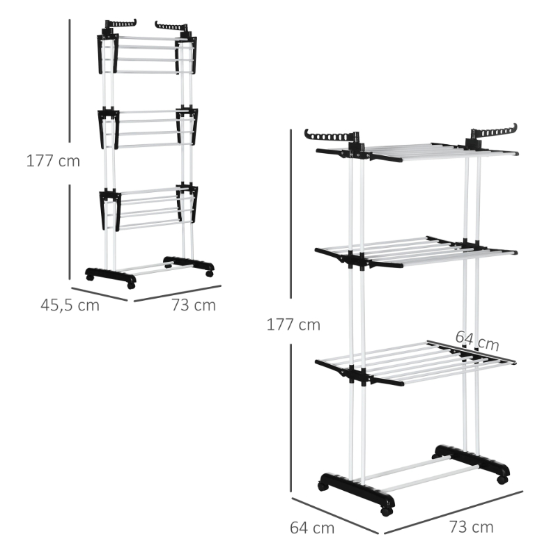 Design dobrável e econômico em espaço: Cada nível possui duas asas dobráveis e 2 peças laterais com 7 orifícios cada, perfeitas para pendurar roupas delicadas em cabides.