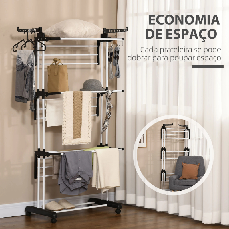 Estendal vertical com 3 níveis e 2 peças laterais dobráveis para pendurar roupas em cabides