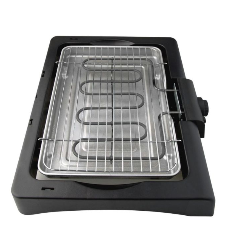 Dispõe de um termostato regulável para ajustar facilmente a temperatura e uma bandeja inferior em aço que recolhe os sucos durante a confeção, facilitando a limpeza.
