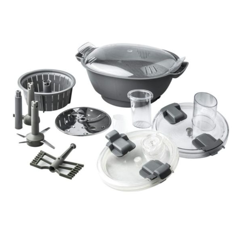 Com 12 funções automáticas — pica, pesa, amassa, bate, funde, emulsiona, monta, mói, aquece sem cozer, coze em lume brando e a vapor — este robot multifuncional substitui vários eletrodomésticos num só.