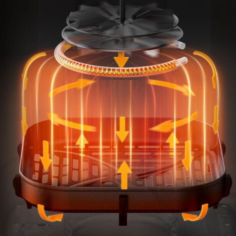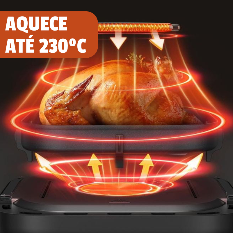 Com 6 litros de capacidade, aquecimento duplo e circulação de ar a 360º, garante resultados uniformes, crocantes por fora e suculentos por dentro — tudo com pouco ou nenhum óleo.