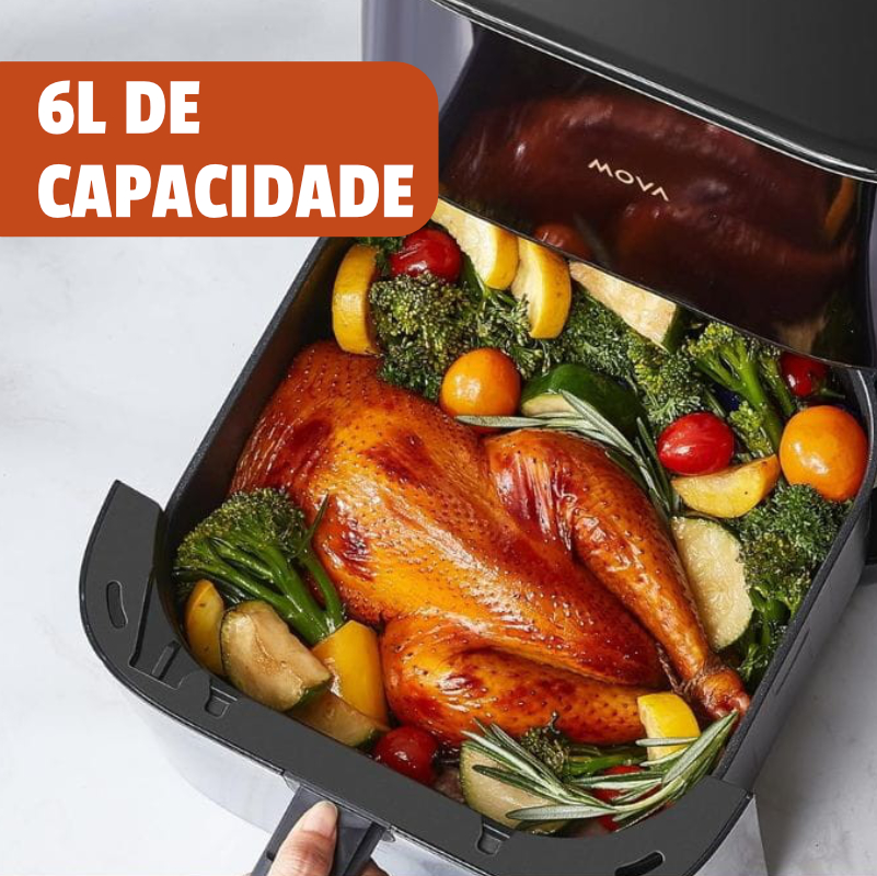 A cuba de 6 litros é ideal para famílias, permitindo cozinhar grandes porções de uma só vez — frango inteiro, batatas, legumes, peixe ou snacks.