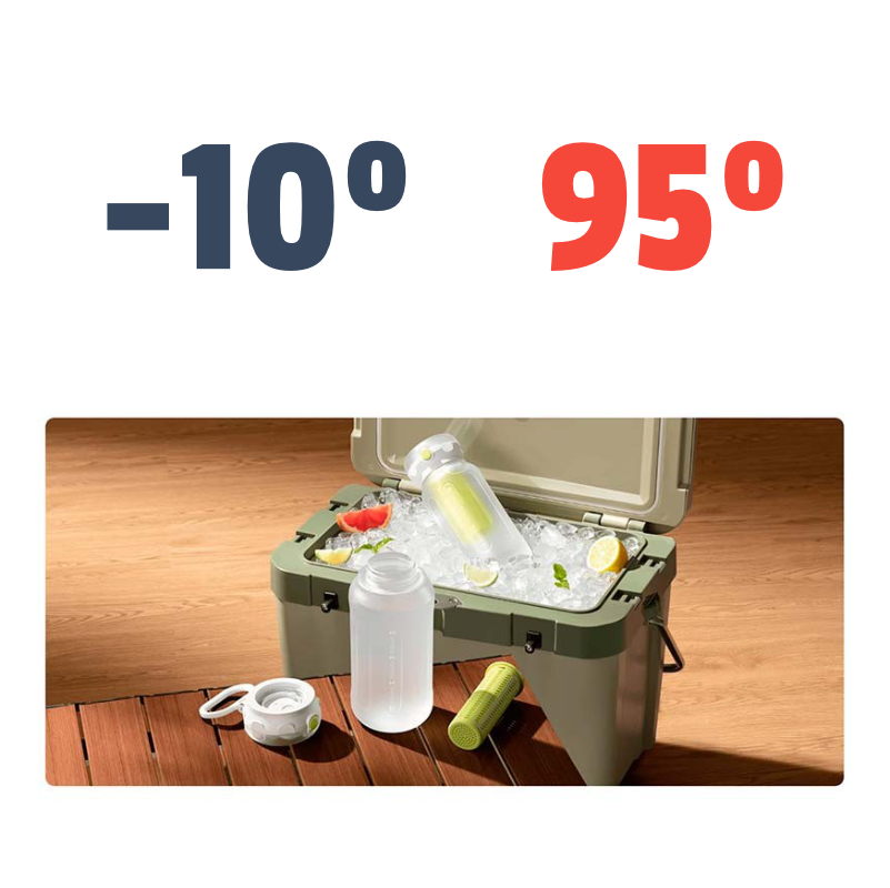 Fabricada em Tritan, um material leve, durável e livre de BPA, esta garrafa suporta variações de temperatura entre -10 °C e +95 °C, sendo adequada tanto para bebidas frias como quentes.