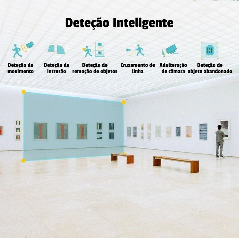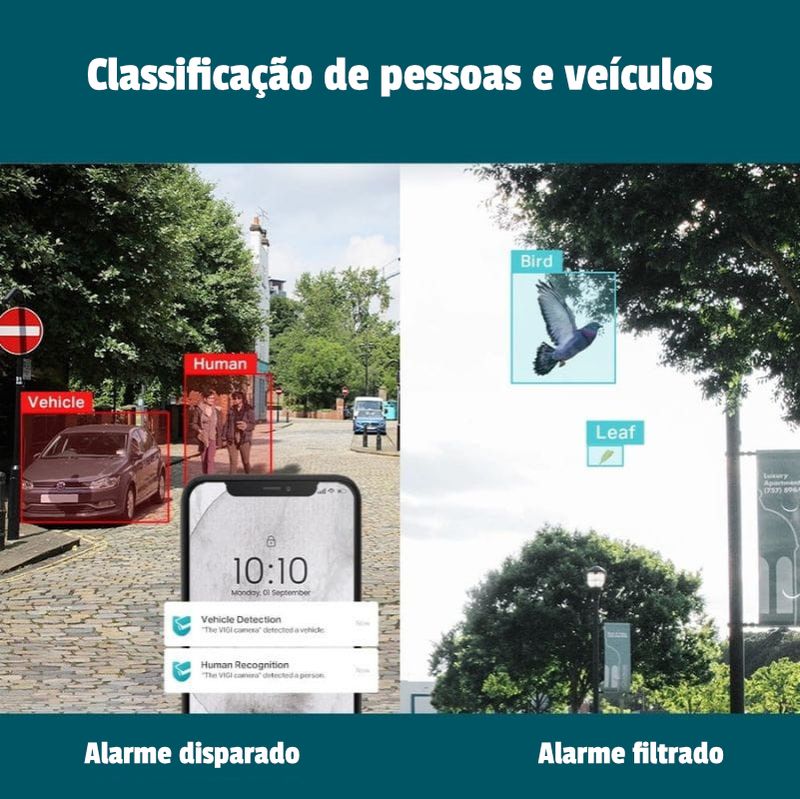 A IA integrada distingue humanos e veículos, reduzindo falsos alarmes e oferecendo regras avançadas de intrusão, cruzamento de linha e remoção de objetos.