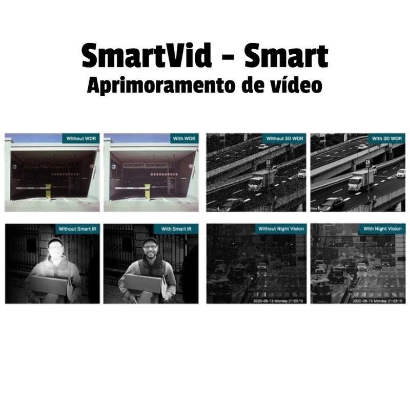 Equipada com compressão H.265+, tecnologia SmartVid (WDR, 3D DNR e Smart IR) e deteção inteligente de pessoas e veículos, garante imagens nítidas, alertas precisos e redução significativa de armazenamento.