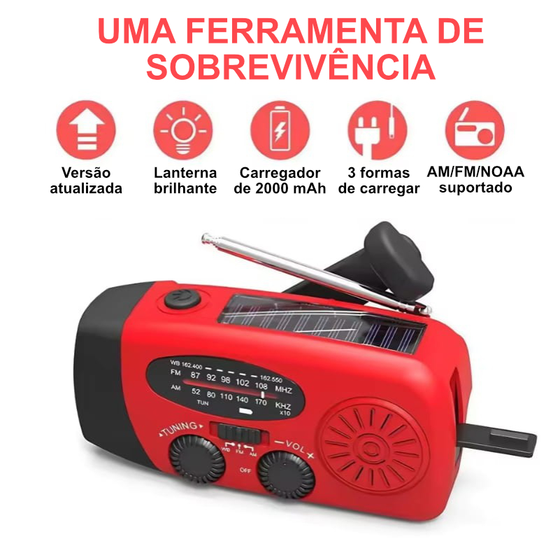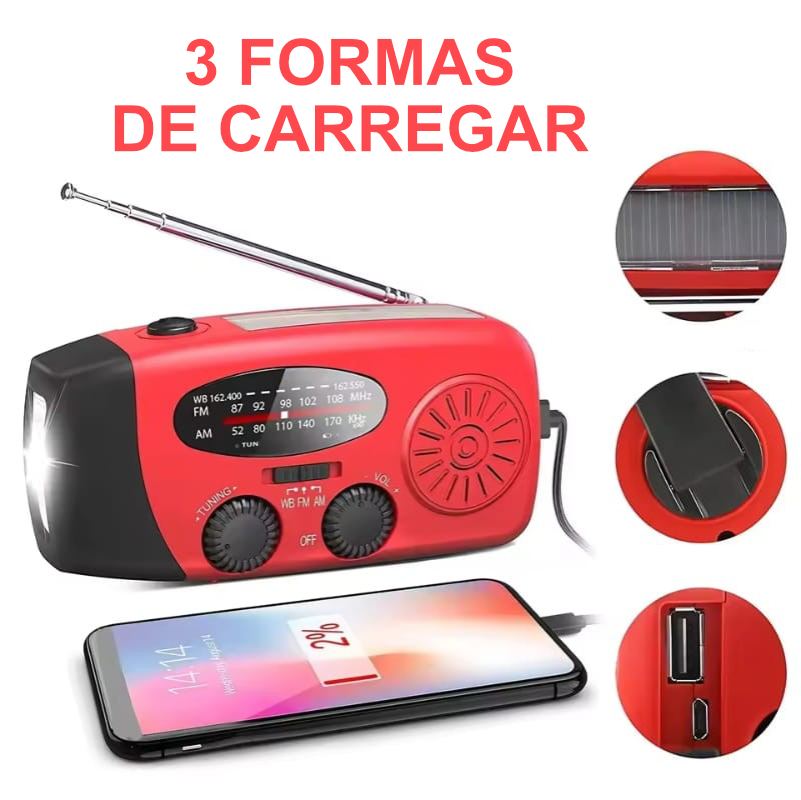 Compacta, portátil e resistente, combina funções de rádio, linterna e carregador portátil, garantindo segurança e conectividade mesmo em ambientes sem eletricidade.