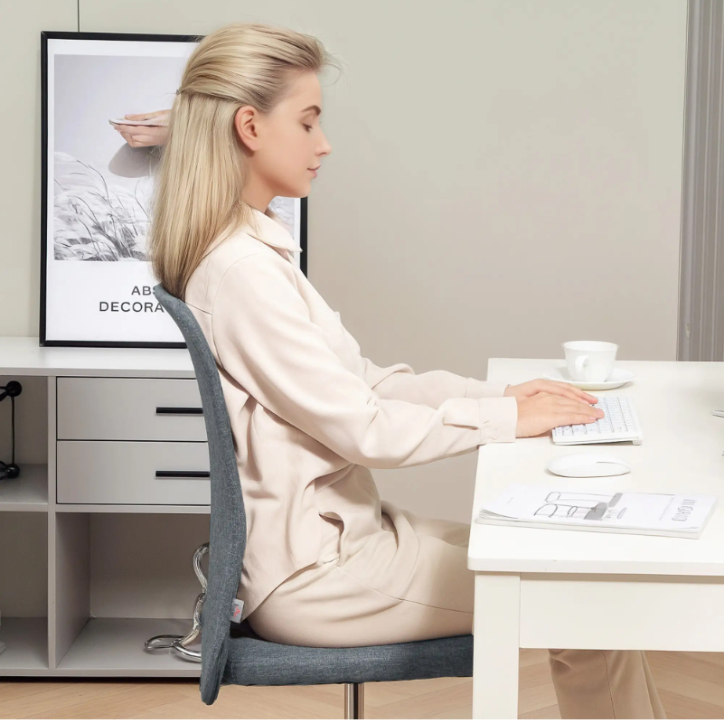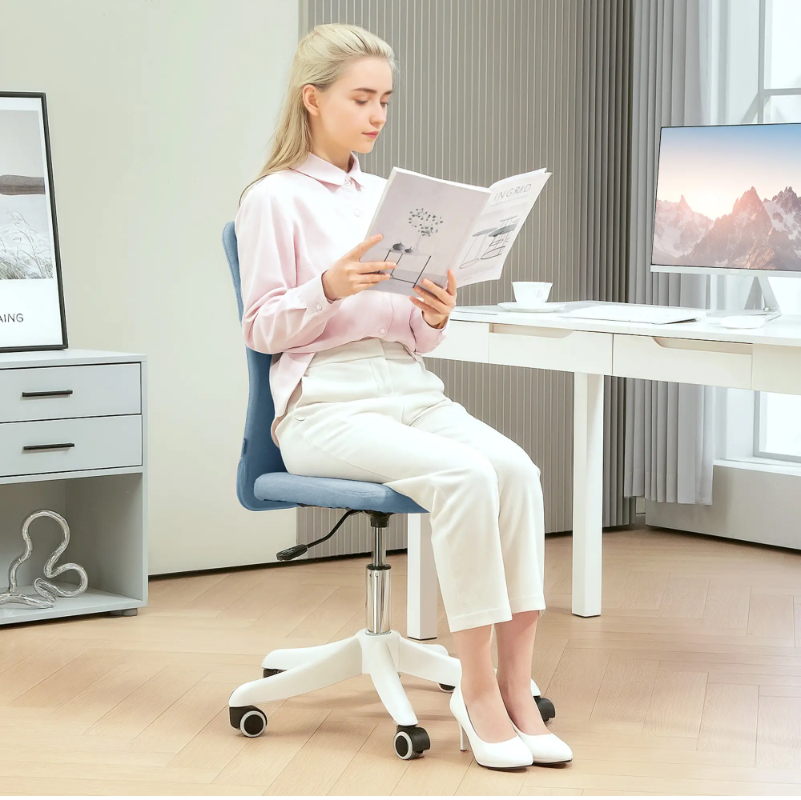 O design sem braços economiza espaço e permite que a cadeira se encaixe perfeitamente em secretárias compactas ou estações de trabalho domésticas.