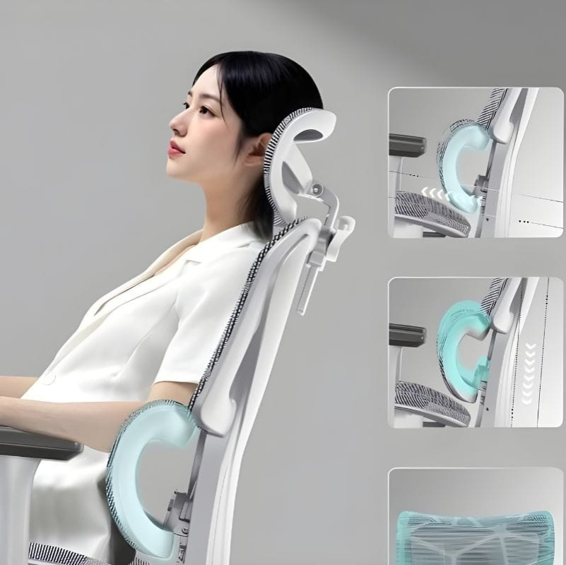 O apoio de cabeça 3D regula-se em altura (até 10 cm) e inclinação (até 70°), proporcionando suporte eficaz à zona cervical durante leitura, chamadas ou videoconferências prolongadas.