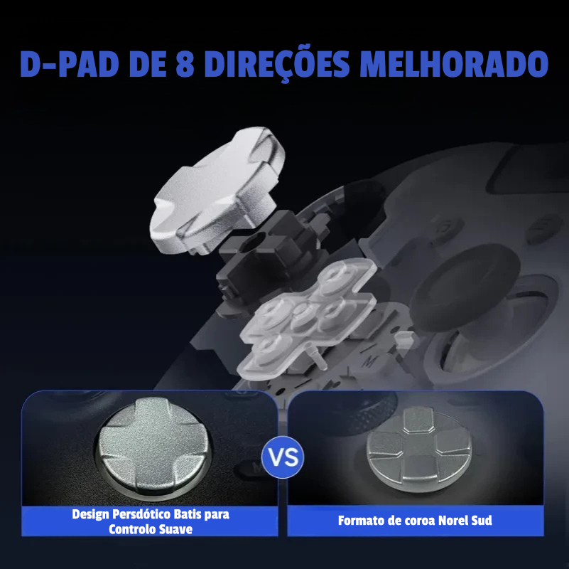 A cruzeta de 8 direções com microswitches garante diagonais limpas e comandos fiáveis em jogos de luta, plataformas e ação.