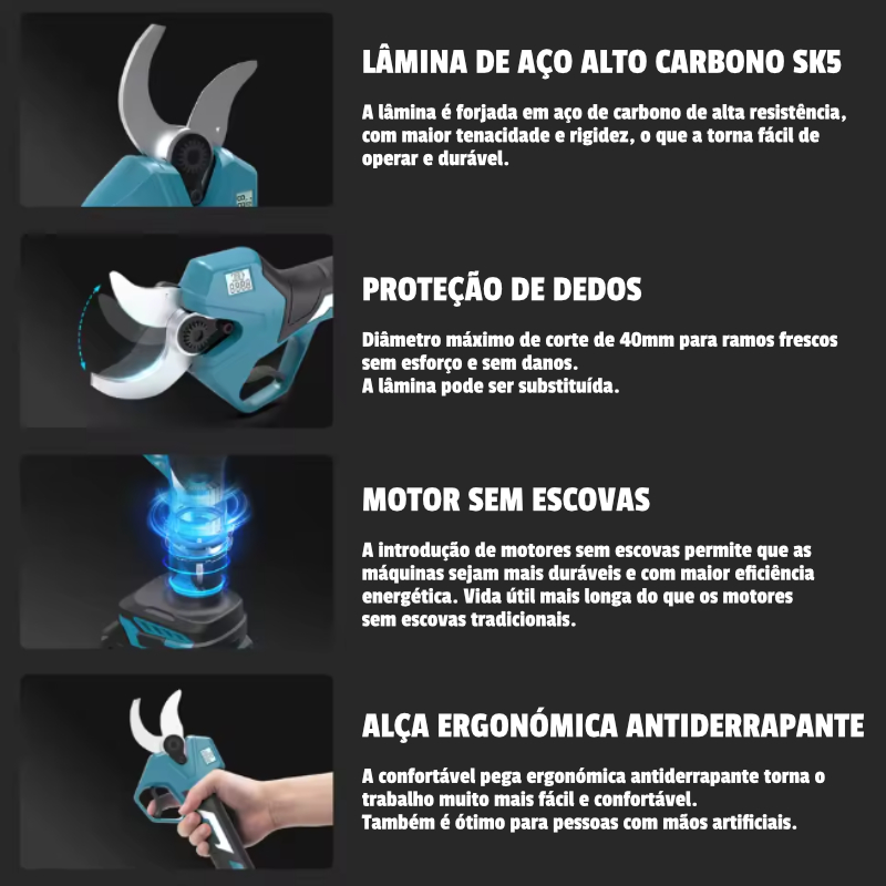 Diâmetro de corte até 40 mm: ideal para galhos grossos, árvores de fruto e poda profissional.