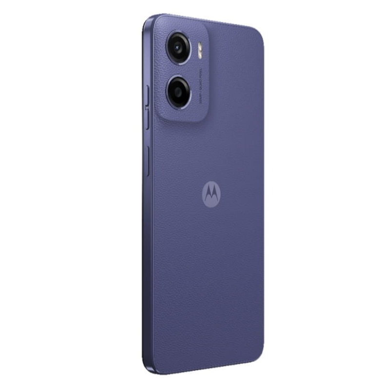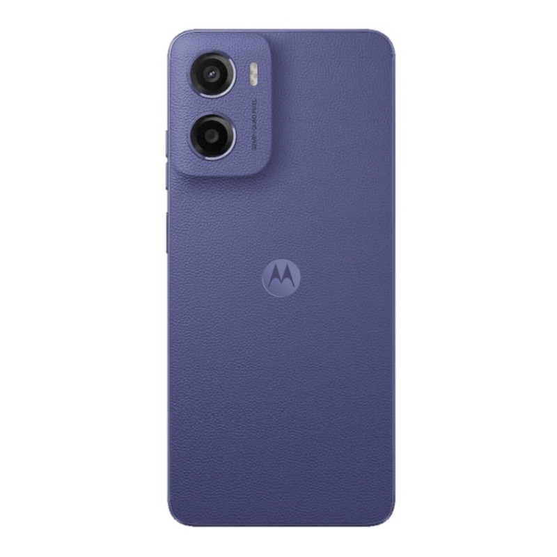 O corpo do Moto E15 combina materiais duráveis com textura antiderrapante e acabamento em pele sintética na elegante cor Lavanda.