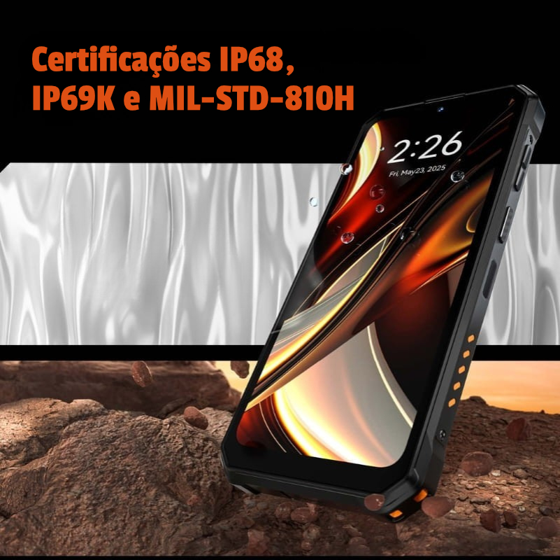 O Oukitel WP53 é um smartphone robusto, desenhado para ambientes exigentes e uso prolongado sem preocupações. Com certificações IP68, IP69K e MIL-STD-810H, resiste à água, pó, quedas e temperaturas extremas.