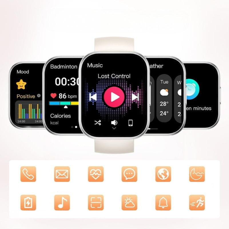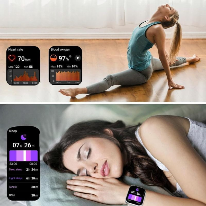 Recursos: Chamadas Bluetooth, assistente de voz por IA, monitor de sono, registro de atividades, controle de música, previsão do tempo, notificações de mensagens